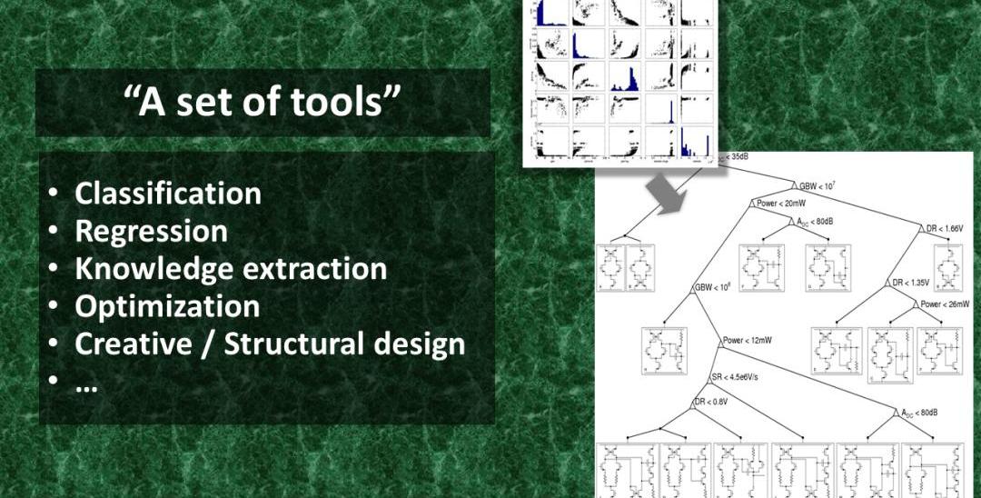 AI可以被看作是一組工具,如分類、回歸、知識提取、優化、創意設計等。下面這張圖片就是一個例子,輸入一個五維的原始數據集,并輸出一棵決策樹,用于做電路設計決策。