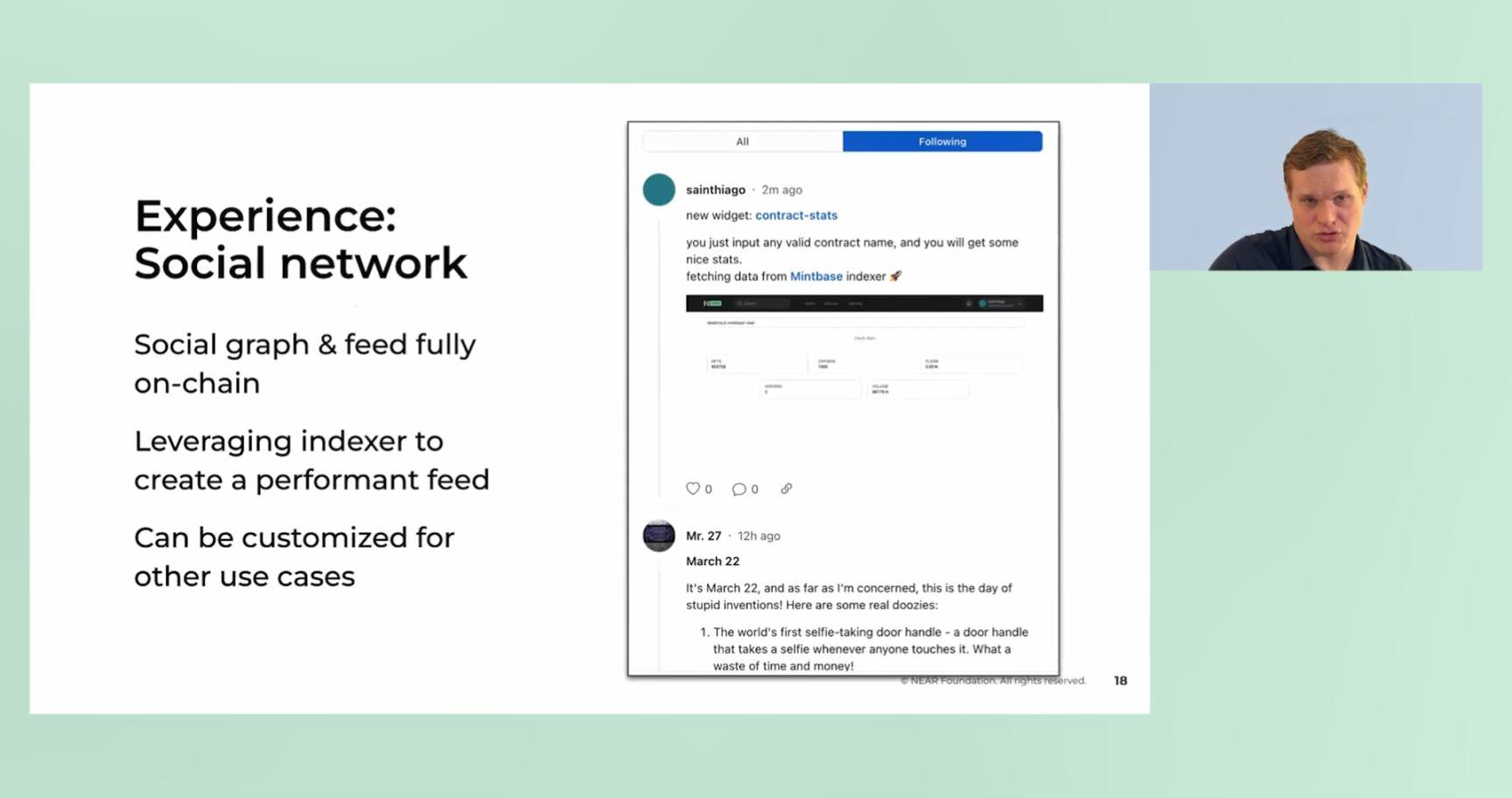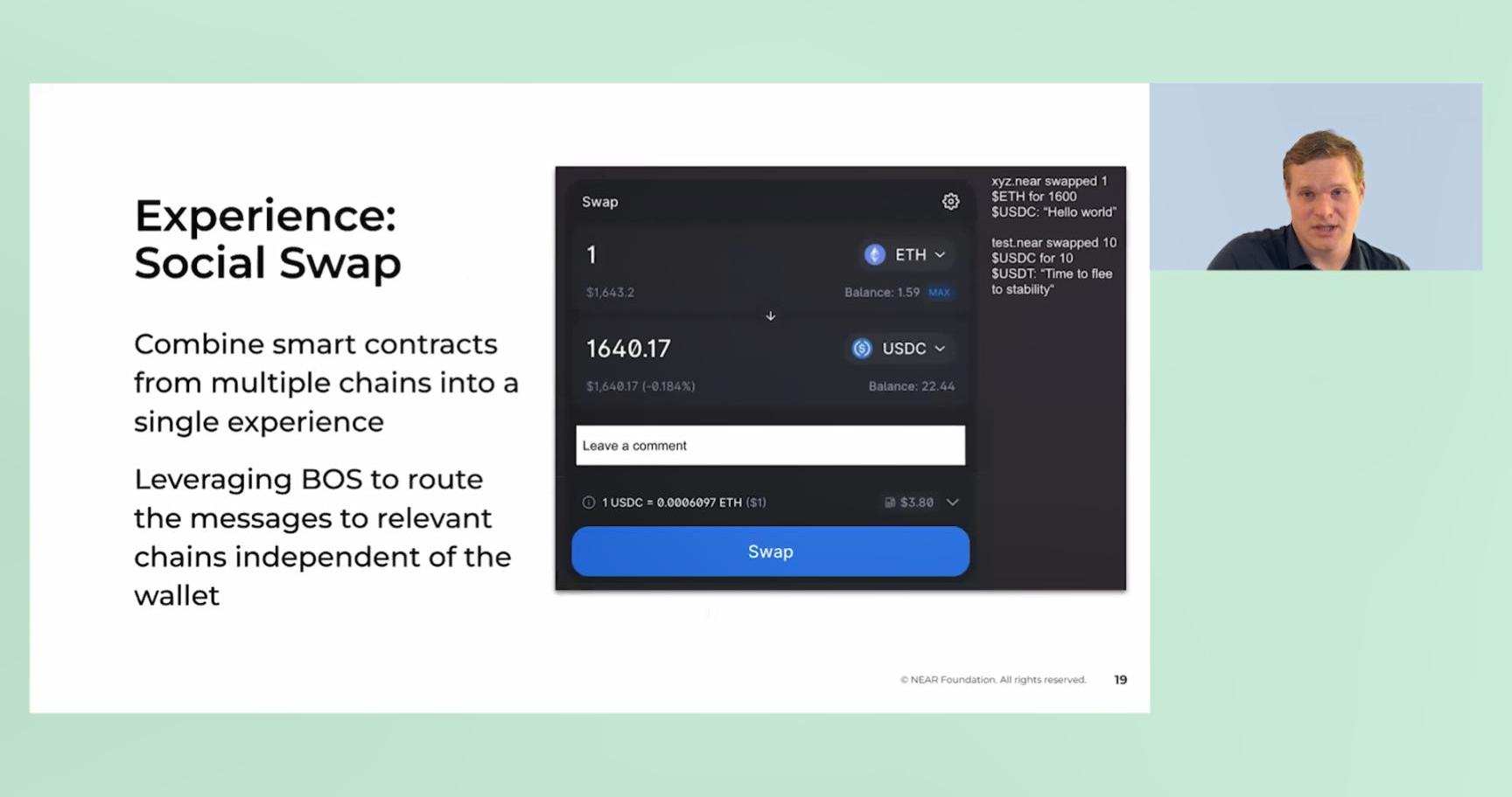 組合事物的一個例子是將Uniswap和socialfeed放在一起。這里的Uniswap來自以太坊,而feed來自NEAR區塊鏈。把它們放在一個應用中,真正展示了你如何組合體驗,而這一操作你在普通區塊鏈上應用中是不會考慮的。