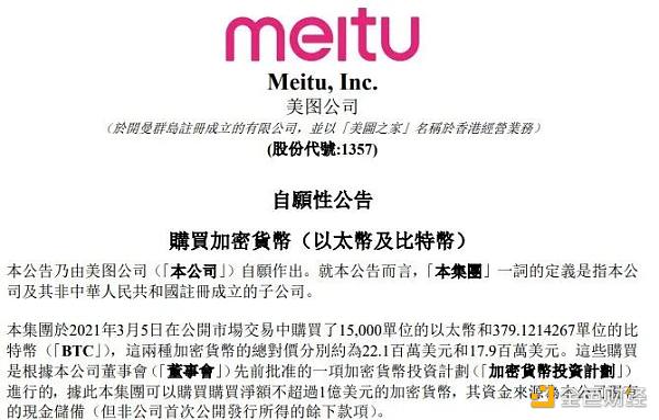 美圖在公告稱,董事會認為,加密貨幣具有足夠的升值空間,并且在此時通過將其部分現金儲備金分配到加密貨幣,可以用作資金管理中分散持有現金的風險(由于全球各國央行在資金管理方面大幅度增加貨幣供應量而產生的貶值壓力)。此外,董事會認為,這能向投資者和利益持份者表明集團接受技術革新的抱負和決心,從而為進軍區塊鏈行業做好準備。