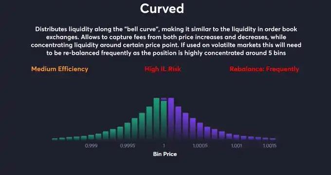 有點像正態分布的鐘形曲線,適合幣種圍繞某一特定價格來回波動的幣種,如果偏離中間價格的話則會有比較大的IL損失。由于跟CEX交易平臺的orderbook結構很像,非常適合做市商用Bot來提供流動性。