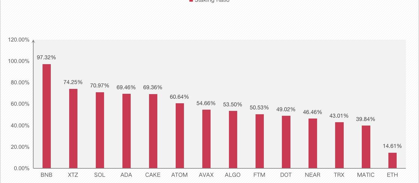 根據Bankless的專業分析:主要原因在于,由于當前以太坊暫時無法實現質押提款,因此很多人對質押持保留和觀望態度。根據Dune統計,僅有14.61%的ETH被質押,遠低于主流加密代幣的質押率。