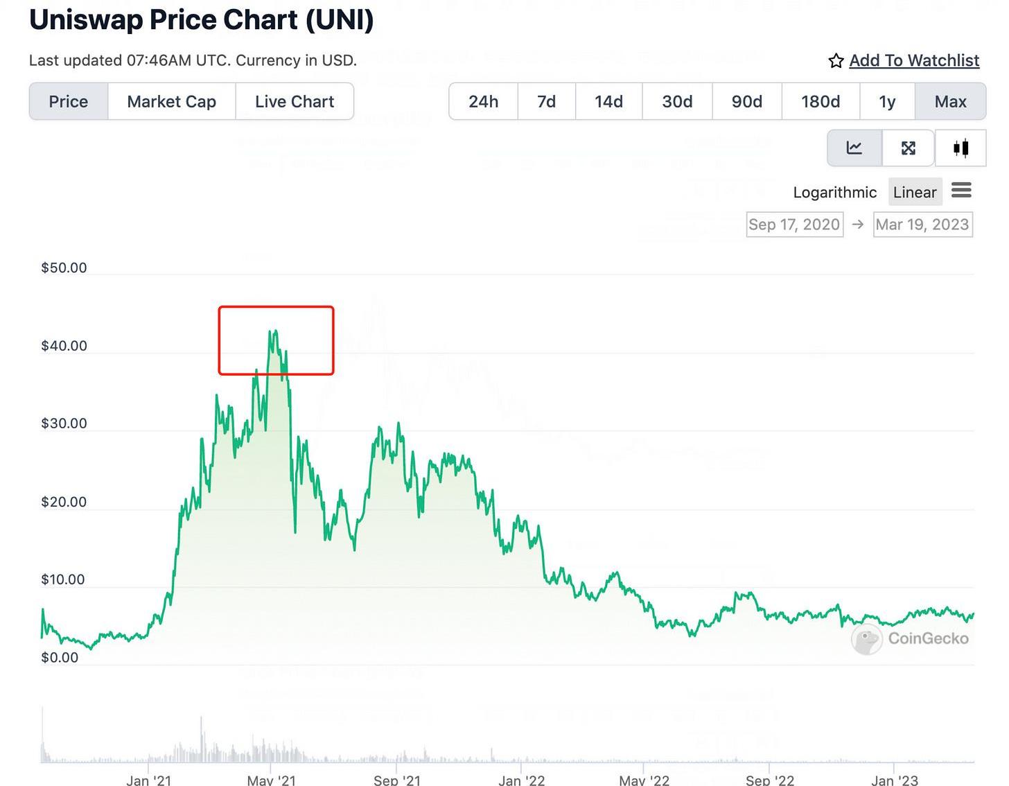 UNI,高點40,對應FDV400億,同期ETH市值4000億,DP=400/4000=10%