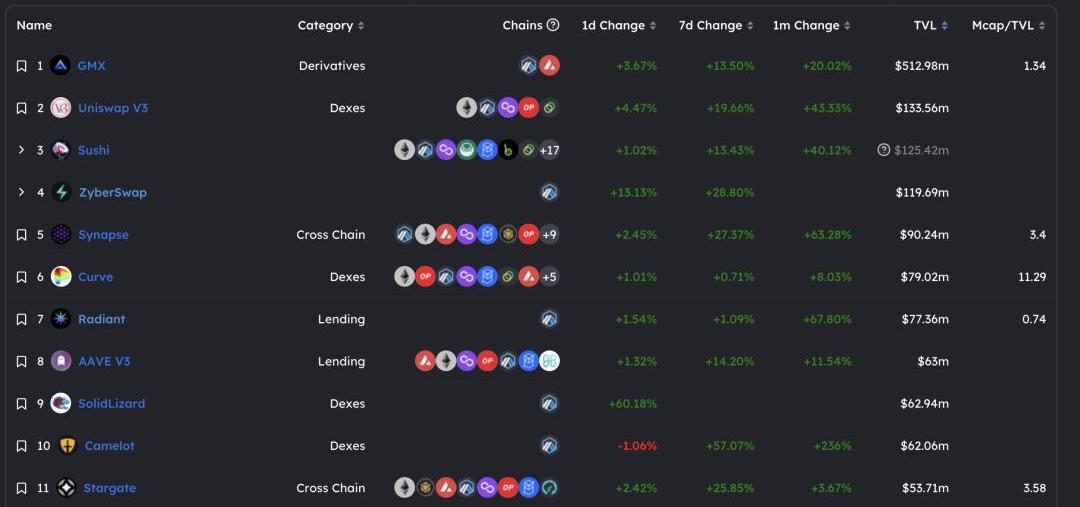 比如當下非常熱的arbitum生態,你可以通過查詢找到arbitum生態目前哪些項目的TVL排名靠前,以及個協議的TVL變化等信息來判斷哪些項目相對來說更有價值一些,輔助篩選項目。