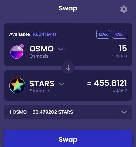 6.SunnyAggarwal的上手建議是通過Osmosis交易一些STARS代幣,因此請使用OsmosisSwap頁面將您想要的OSMO數量換成STARS